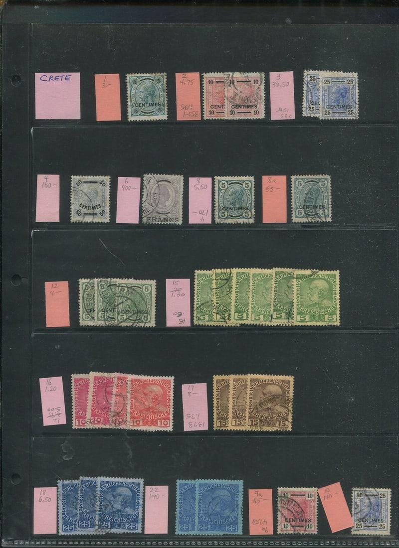 Austria Offices in Crete 1903 - 1915, a used group of 15 different stamps 32 in total of the overprints and Franz Josef issues, all identified by Scotts, includes #4, #6, #9a, #10 and #22, Scott value $1049.75, this material not often seen, with monor faults, appears f-vf