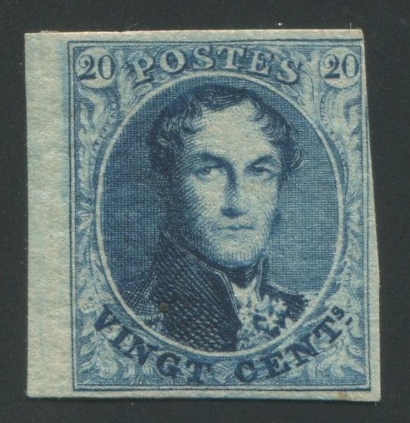 Belgium 1851-1854 #, a MH 20c blue on thick woven paper, wmk 96a without frame (Scott value $800, with 3 good margins, just into at UL corner, dry gum, otherwise appears f-vf