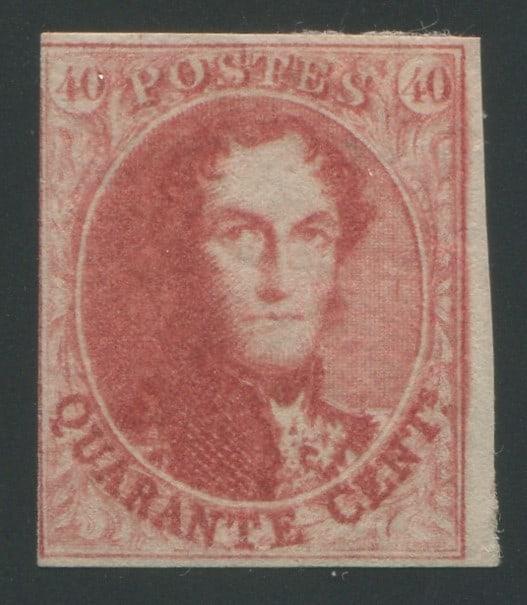 Belgium 1858 - 1861 #12, MH 40c vermilion, Scott value $3750, has close to good margins, gum missing UL corner, appears f-vf