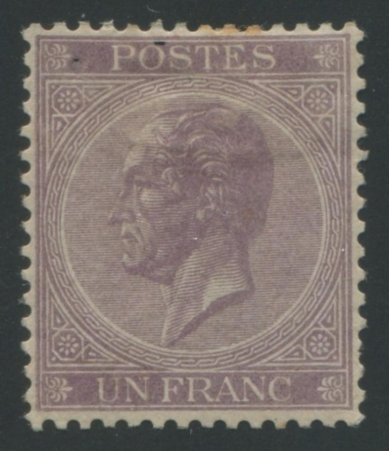 Belgium 1865 #17, a MH 1fr violet, Scott value $1750,, HR otherwise appears f-vf