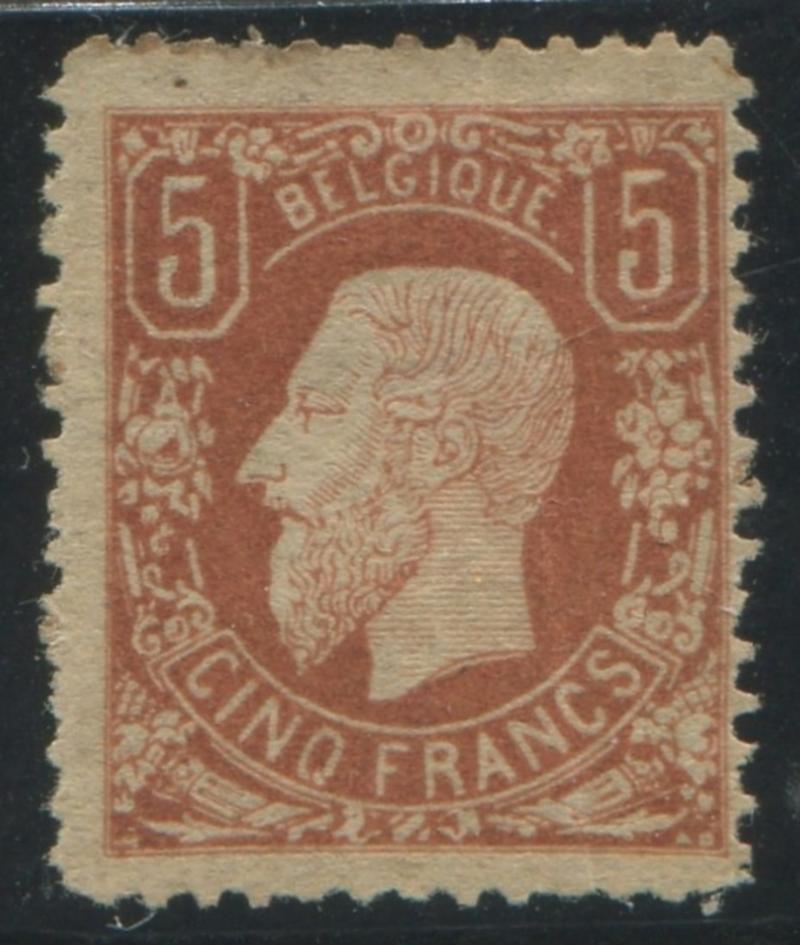 Belgium 1875 #39, a MH 5fr deep red brown, perf 15,toned gum and short perfs at LL corner, Scott value $1700, appears fine
