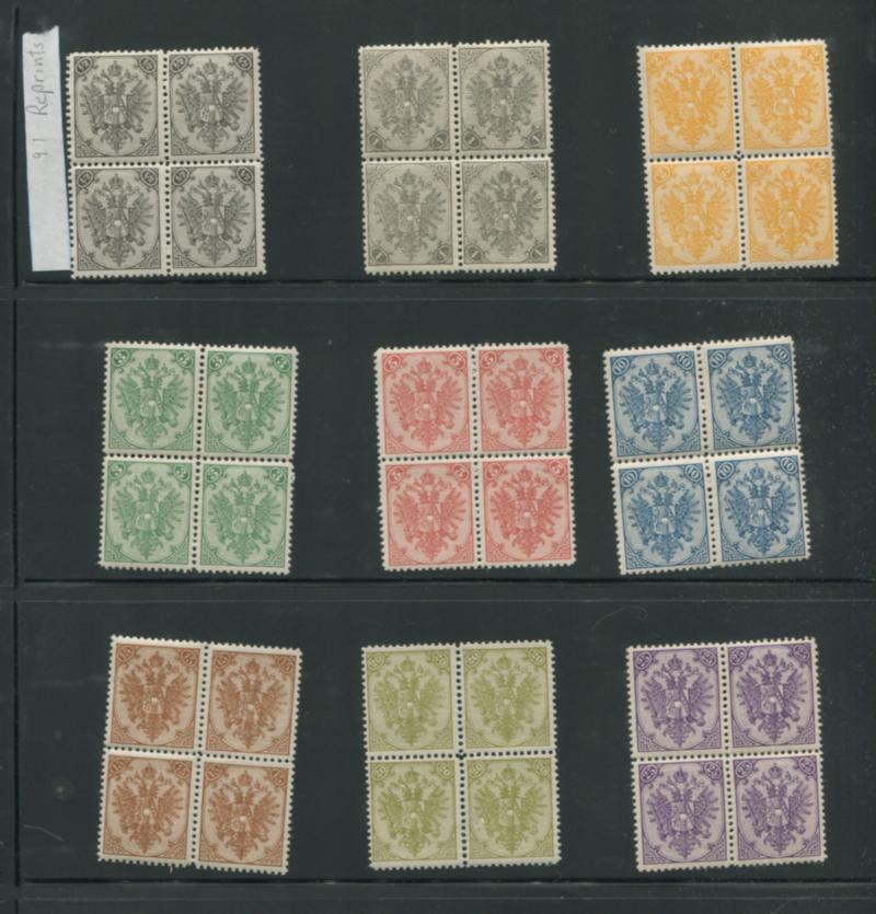 Bosnia 1911 reprints MNH / MH, #1a /#10a on white paper and perforated at 12 1/2 in blocks of four, Scott value $130, appears f-vf