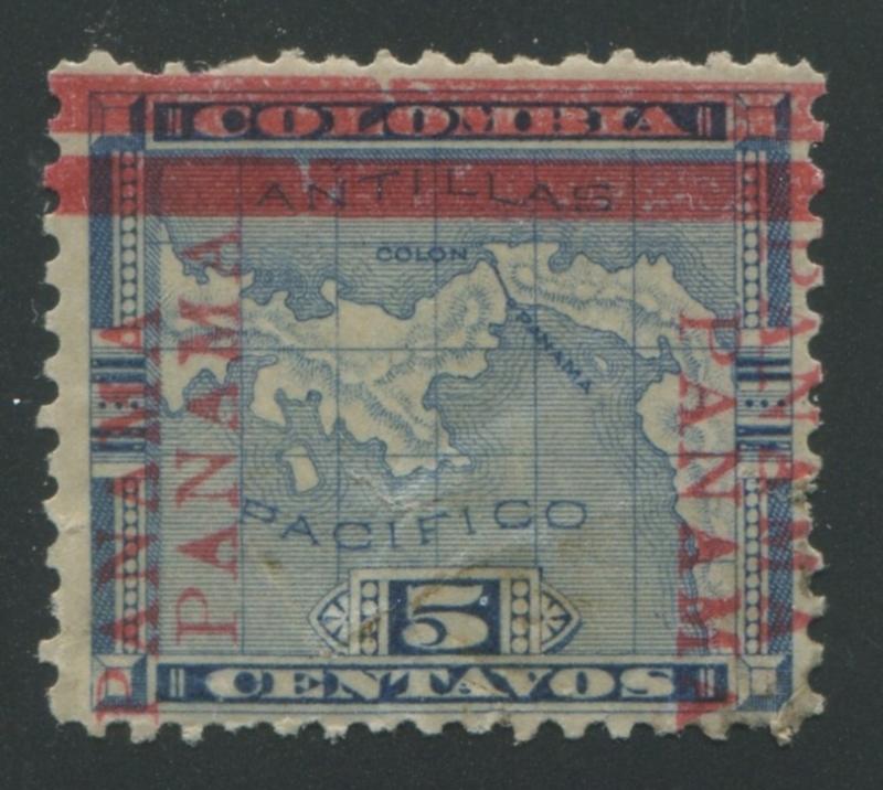Canal Zone 1904 - 1906 #12d , MH 5c blue with Panama" double overprinted Scott value $1100 has gum disturbance and a couple of short perfs appears f-vf