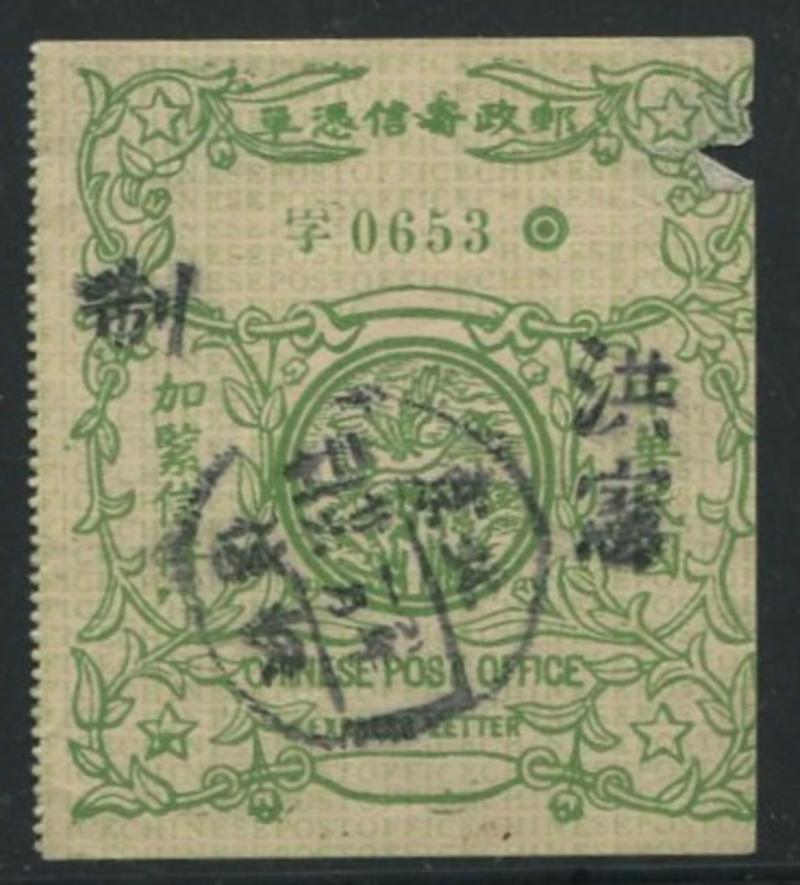 China 1916 #E10a, 10c green used,Scott Value $550, has a small cut into the design, otherwise appears f-vf