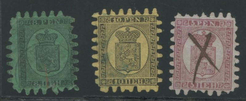 Finland 1866 -1874 #7 /#12a, a used group of #7 8p black and green, #8 10p blacl and yellow,and #12a5p red brown , roulette II, Scott value $735, with faults , appears fine
