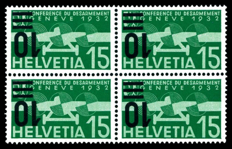 N°20a, 10 sur 15c vert et vert-clair, surcharge renversée en bloc de quatre. SUPERBE. R.R. (certificat) Qualité: ** Cote: 52000 euros
