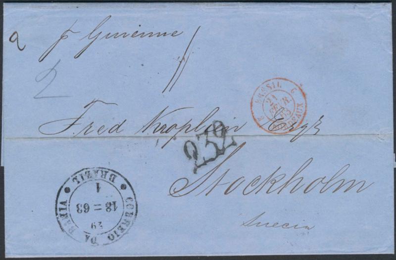 Sweden, Postage due mail Postage due mark 232 on 2-fold letter conveyed by steamer 'Guienne' from RIO DE JANEIRO 29.1.1863 to France, then sent via HAMBURG KSPA(D) to STOCKHOLM 1.TUR 27.2. Superb.