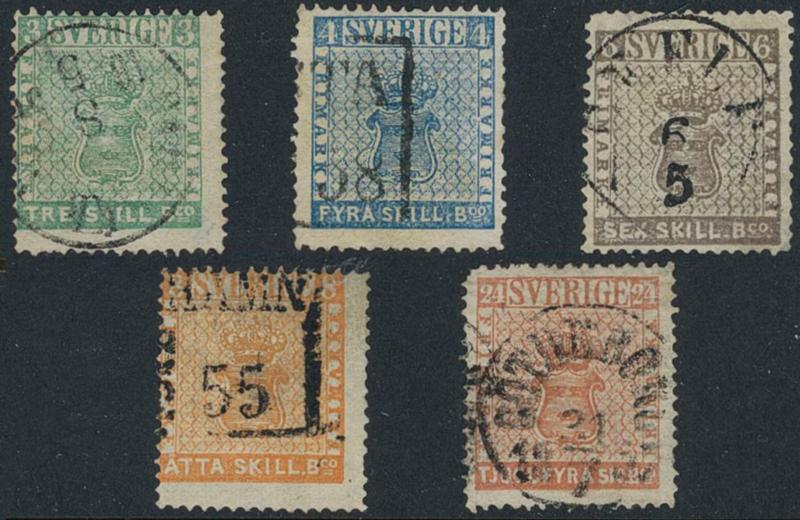 Sweden, Facit 1–5 used, 3–24 skill bco SET (5). Two with certificate: 3 skill bco, 1a HOW 1.2.3 and 24 skill bco, 5a N. Svensson 1.4.3. 2 more images are available at www.philea.se