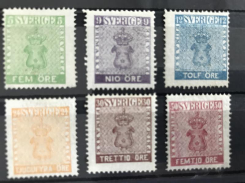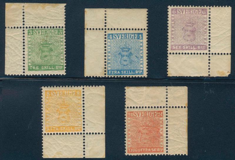 Sweden, Facit 1–5 E4 **/*, SET reprint perf 13 (5). 3, 4 and 24 skill bco ** and 6, 8 skill bco *. Slightly yellowed paper. F 25000