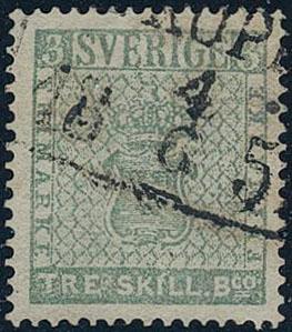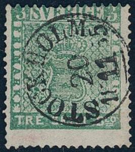 Sweden, Facit 1b or Scott 1 used, 3 skill bluish green (small thin spot, some short perf). Canc. STOCKHOLM 20.11.1855 (owner mark on reverse). Cert. Mats Nilsson: 1, 1, 3. F 50000 1 more image is available at www.philea.se.