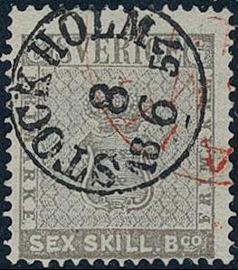 Sweden, Facit 3b or Scott 3 used, 6 skill light grey on thin paper. Nice canc. STOCKHOLM 8.6.1857 and a red arrival canc. Cert. Per Sjöman and sign. Strandell. 1 more image is available at www.philea.se.