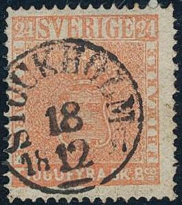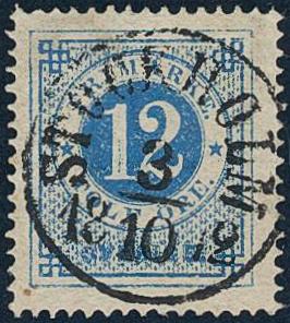 Sweden, Facit 21b or Scott 22 used, 12 öre dull ultramarine-blue on yellowish paper. EXCELLENT cancellation STOCKHOLM 3.10.1872. Signed by O.P. 1 more image is available at www.philea.se.