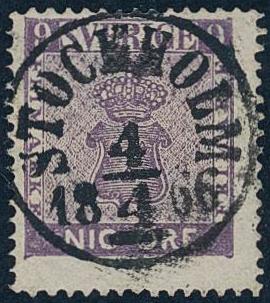 Sweden, Facit 8c or Scott 7a used, 9 öre blue-lilac. Superb cancellation STOCKHOLM 4.4.1866.