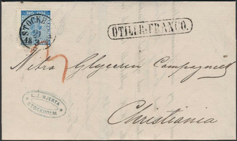Sweden, Facit 9 or Scott 8 cover, 12 öre blue on beautiful cover with contents sent to Norway. Canc. STOCKHOLM 21.3.1867 and OTILLR.FRANCO in frame.