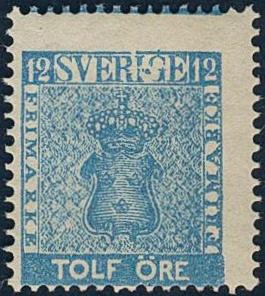 Sweden, Facit 9v13 or Scott 8 *, 12 öre blue-greenish blue with 'dot in 'G' variety'. Very unusual in mint condition, without price in Facit.