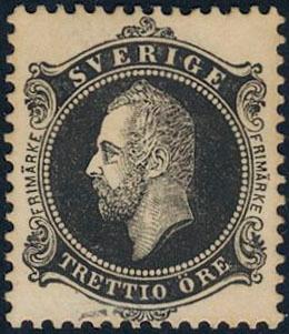 Sweden, Facit (*), C A Nymans proposal stamp TRETTIO öre in black colour with smooth background.