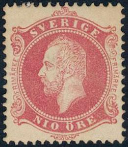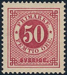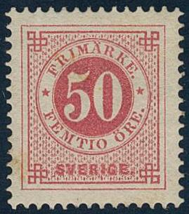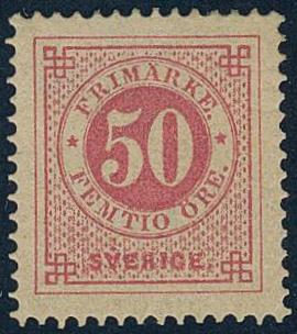 Sweden, Facit 36b or Scott 36 *, 50 öre carmine-rose. Superb example with EXCELLENT centering. The gum somehat moisture affected. Very scarce shade in this quality. Certificate HOW 4, 5, 3 (2007). 1 more image is available at www.philea.se.