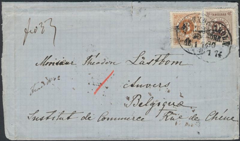 Sweden, Facit 17e, 25e cover, 3+30 öre on fine cover sent pre-GPU from STOCKHOLM NORR 30.1.1874 to Belgium. Scarce rate. Certificate HOW 2, (3,4) (3,1), 2 (1988). F 15000 1 more image is available at www.philea.se.