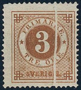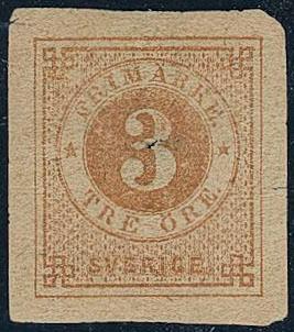 Sweden, Facit 17v6 or Scott 17 *, 3 öre brown, paper folded before printing. Small imperfectins of less importancance. Very rare variety in mint condition, unknown according to Facit.