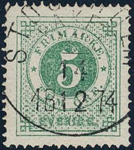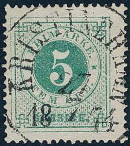 Sweden, Facit 19b or Scott 19 used, 5 öre light bluish green on white paper. EXCELLENT cancellation KRISTINEHAMN 27.7.1874.