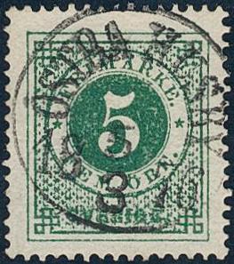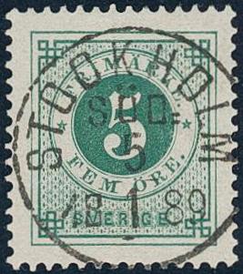Sweden, Facit 43a or Scott 43 used, 5 öre dull blue-green. EXCELLENT cancellation STOCKHOLM SÖD 5.1.1889.
