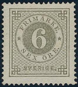 Sweden, Facit 20g or Scott 21 (*), 6 öre olive-grey. Superb centering. Certificate HOW 3, 4, 1 (2006). 1 more image is available at www.philea.se.