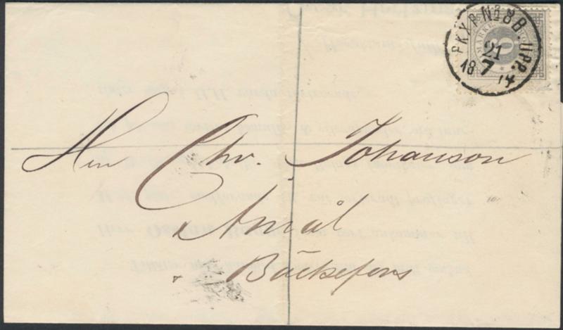 Sweden, Facit 20h or Scott 21 cover, 6 öre bluish grey on beautiful printed matter sent from PKXP Nr 8B UPP 21.7.1874 to Åmål. Scarce shade on cover. F 3000