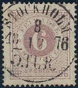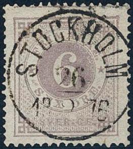 Sweden, Facit 20k or Scott 20 used, 6 öre red-lilac. EXCELLENT cancellation STOCKHOLM 5.TUR 8.12.1876.