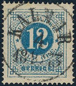 Sweden, Facit 21g or Scott 22 used, 12 öre greenish blue on ordinary paper. EXCELLENT cancellation KALMAR 4.10.1873. 1 more image is available at www.philea.se.