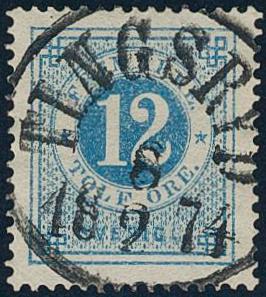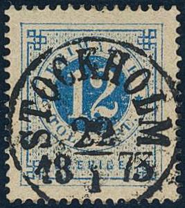 Sweden, Facit 21h or Scott 22 used, 12 öre clear blue on yellowish paper. EXCELLENT cancellation STOCKHOLM 22.1.1873. Signed by O.P. 1 more image is available at www.philea.se.