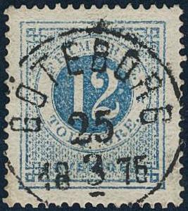 Sweden, Facit 21m or Scott 22 used, 12 öre blue. EXCELLENT cancellation GÖTEBORG 25.3.1875. Signed by O.P.