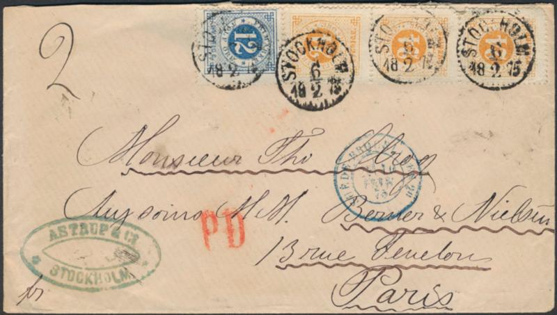 Sweden, Facit 21o, 24d cover, 12+3×24 öre on double rate pre-GPU cover sent from STOCKHOLM 6.2.1875 to France. Scarce combination, three recorded according to Ferdén. Certificate HOW 3 (3,3,4,4) (4×3) 3 (2011). F 10000 1 more image is available at www.philea.se.