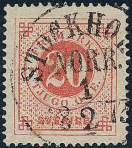 Sweden, Facit 22a or Scott 23 used, 20 öre orange-red on yellowish paper. Superb cancellation STOCKHOLM NORR 1.2.1873. Signed by O.P. 1 more image is available at www.philea.se.