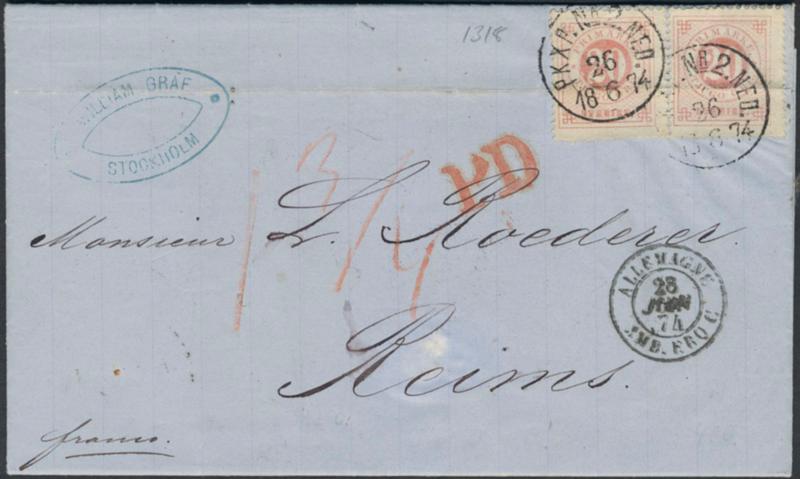Sweden, Facit 22d or Scott 23 cover, 2×20 öre pale red on beautiful cover sent pre-GPU from PKXP No 2 NED 26.6.18. 74 via Germany to France, with arrival pmk REIMS 29.JUIN.74. Light archive fold through the stamps. Nice cover with a very scarce rate. Certificate HOW 2 (3,3), (3,4) 2 (1998). Ex. Gunn