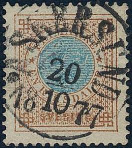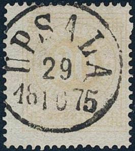 Sweden, Facit 22f or Scott 23a used, 20 öre pale orange. Superb cancellation UPSALA 29.10.1875. One double perf.