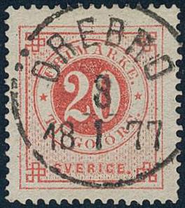 Sweden, Facit 22g or Scott 23a used, 20 öre dull red. EXCELLENT cancellation ÖREBRO 8.1.1877. Signed by O.P.