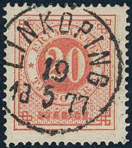Sweden, Facit 23a or Scott 23b used, 20/20 öre brick-red on pale orange. Superb cancellation LINKÖPING 19.5.1877.