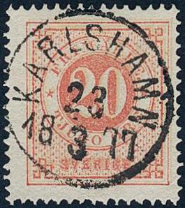 Sweden, Facit 23c or Scott 23b used, 20/20 öre dull red on pale orange. EXCELLENT cancellation KARLSHAMN 23.3.1877.