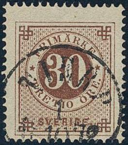 Sweden, Facit 25a1 used, 30 öre dark reddish brown on translucent paper. Beautiful example cancelled TIERP 1.10.1872. Very scarce shade. Signed by O.P. F 5000