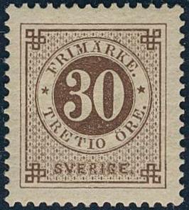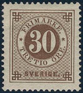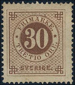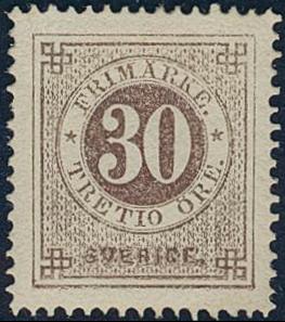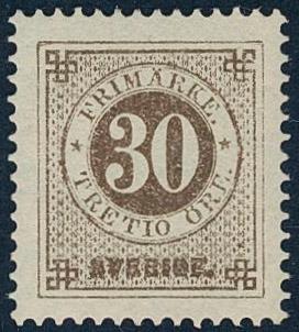 Sweden, Facit 25g (*), 30 öre orange-brown, blurred print. EXCELLENT centering. Certificate HOW 3, 5, 1 (2007). 1 more image is available at www.philea.se.