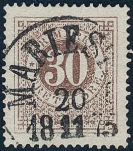 Sweden, Facit 25h used, 30 öre greyish brown. EXCELLENT cancellation MARIESTAD 20.11.1875.