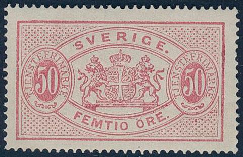 Sweden, Official Facit Tj9a **, 50 öre violetish carmine, perf 14, blue-greyish paper. One somewhat short perf. Scarce stamp as MNH. Certificate Mats Nilsson 3, 4, 5 (2025). F 14000 1 more image is available at www.philea.se.