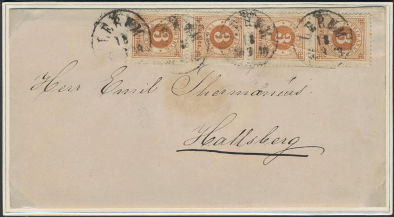Sweden, Facit 28v6 or Scott 28 cover, 3 öre brown, paper folded before printing. Strip of four, with three stamps with the variety, on cover sent from LERUM 18.9.1878.