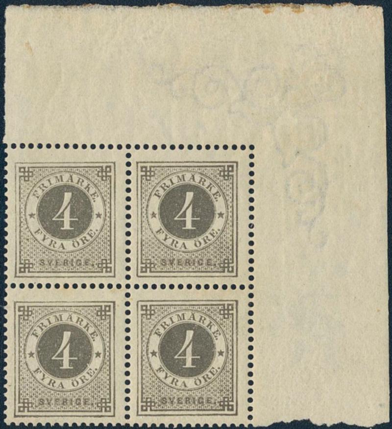 Sweden, Facit 29 or Scott 29 **, 4 öre grey in block of four with corner sheet margin. Toned, partly disturbed gum, traces of hinge in margin. F 32500