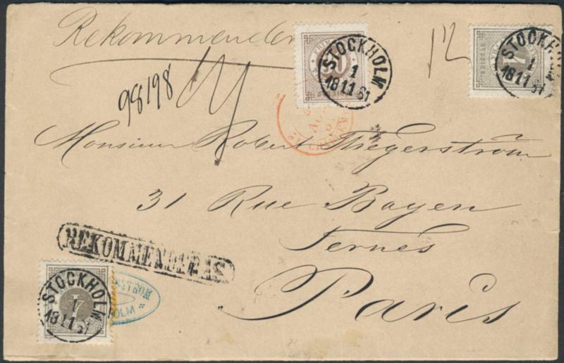 Sweden, Facit 29b, 35e cover, 2×4+30 öre on superb registered cover sent from STOCKHOLM 1.11.1881 to France. Certificate HOW 4 (3,3,4) (4,4,4) 4 (2002).. 1 more image is available at www.philea.se.