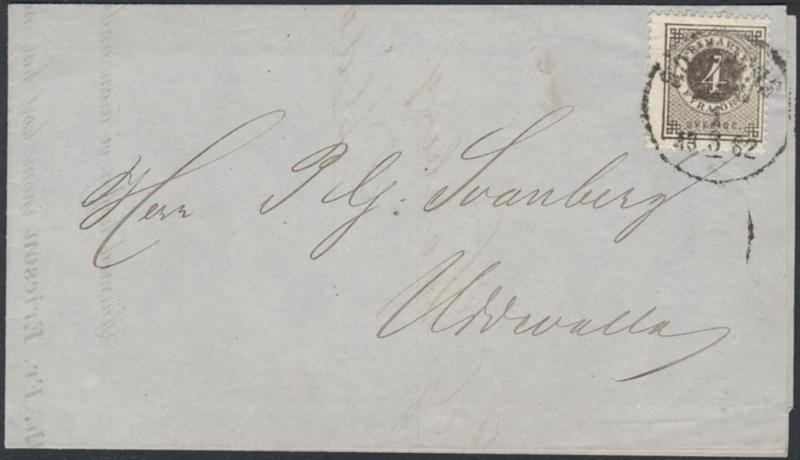 Sweden, Facit 29c2 or Scott 29 cover, 4 öre greyblack. Printed matter sent from GÖTEBORG 1.3.1882 to Uddevalla. Certificate HOW 3, 3, (2–3), 3 (2003). 1 more image is available at www.philea.se.
