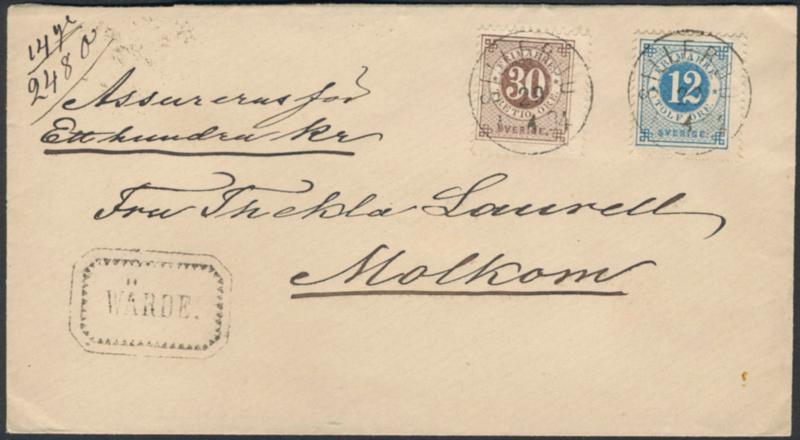 Sweden, Facit 32, 25 cover, 12+30 öre on very beautiful insured cover sent from SILLERUD 29.4.1884 via GILLBERGA 29.4.1884 to Molkom. Superb.