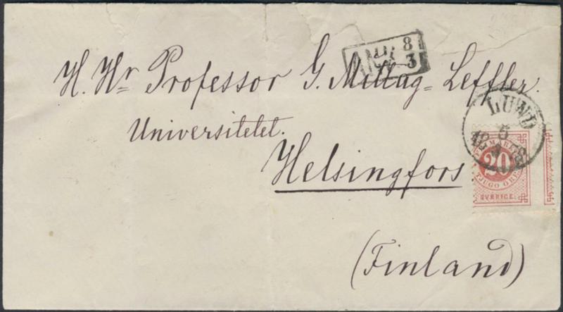 Sweden, Facit 33v8 or Scott 33 cover, 20 öre red, extremely displaced perf. Exceptional variety on cover (somewhat carelessly opened) sent from LUND 5.31878 via STOCKHOLM K.E. 6.3.1878 to Finland, with arrival pmk ANK 8.3..