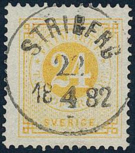 Sweden, Facit 34d or Scott 34a used, 24 öre yellow. EXCELLENT cancellation STRIBERG 22.4.1882.