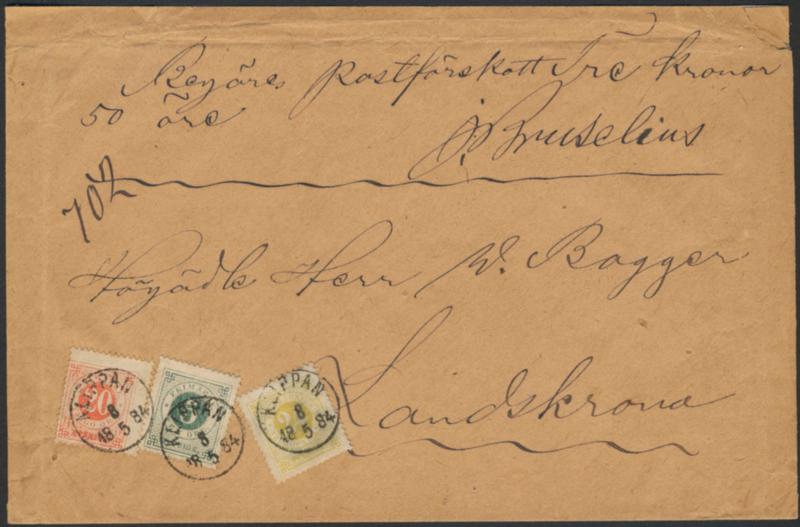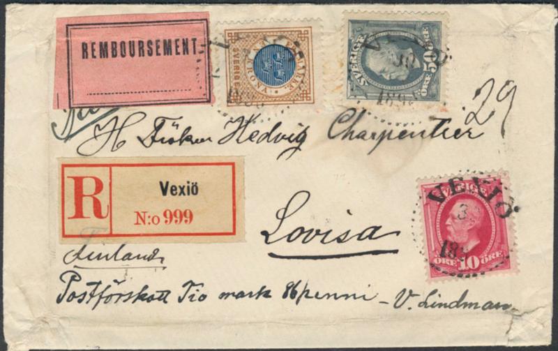 Sweden, Facit 49, 54, 59 cover, 10+50 öre + 1 kr on registered cash on delivery cover sent from VEXIÖ 30.1.1895 to Finland. Very scarce, one of the earliest UPU Remboursement mail from Sweden to any foreign country. 1 more image is available at www.philea.se.
